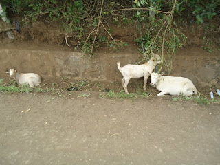 9) Single cows and/or goats tied up on the side of the road eating their patch of grass.